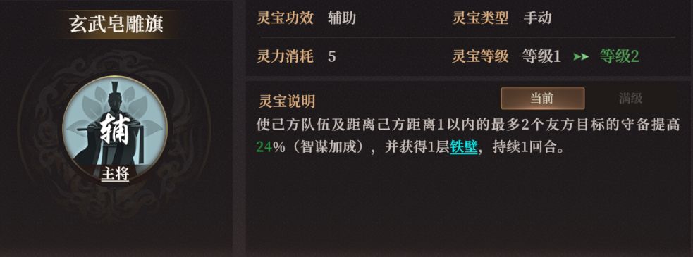 玄武皂雕旗在《封神:开天》中作为辅助类型法宝,将洪锦设为主将即可发动其效果:使已方队伍及距离己方距离1以内的最多2个友方目标的守备提高24%(智谋加成),并获得1层铁壁,持续1回合。