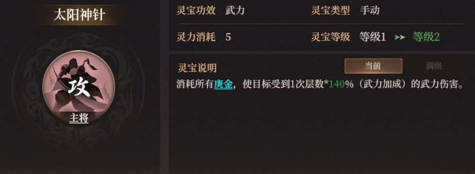 太阳神针在《封神:开天》作为一件攻击型法宝,将高兰英设定为主将时,发动其法宝效果可以消耗所有庚金,使目标受到1次层数*140%(武力加成)的武力伤害。
