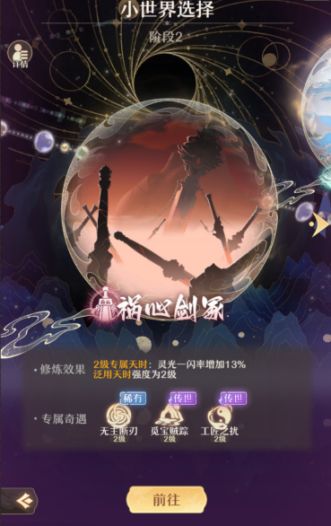小世界会带来不同的修炼效果以及更多的奇遇事件,您可以根据修炼的需求进行选择,比如灵光一闪率、共鸣效率提升等等。