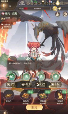 所以,精力不足时,大人请点击“炼丹”按钮,让弟子服用仙药恢复精力,这样就又能生龙活虎地继续修炼了。