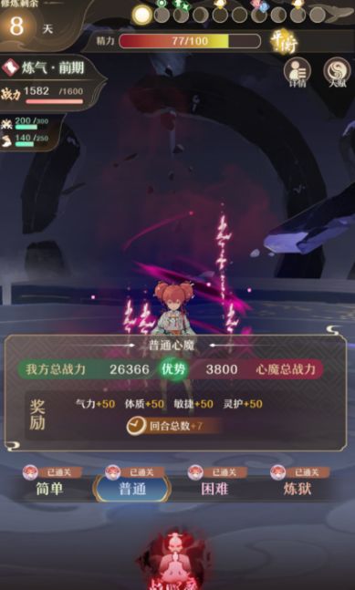 心魔挑战分为四个难度,选择难度越高获得的奖励就越多,大人请根据自己的战力数值进行选择合适的难度挑战。