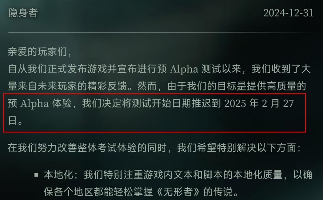 布什戈们,怎么就延期了?本来打算看看这次海外测试,又新增了些什么内容,结果跟我说跳票到二月了?本来还挺期待这游戏的,结果整这一出。总不能是因为春节要到了,没人维护,所以跳票了吧(bushi)