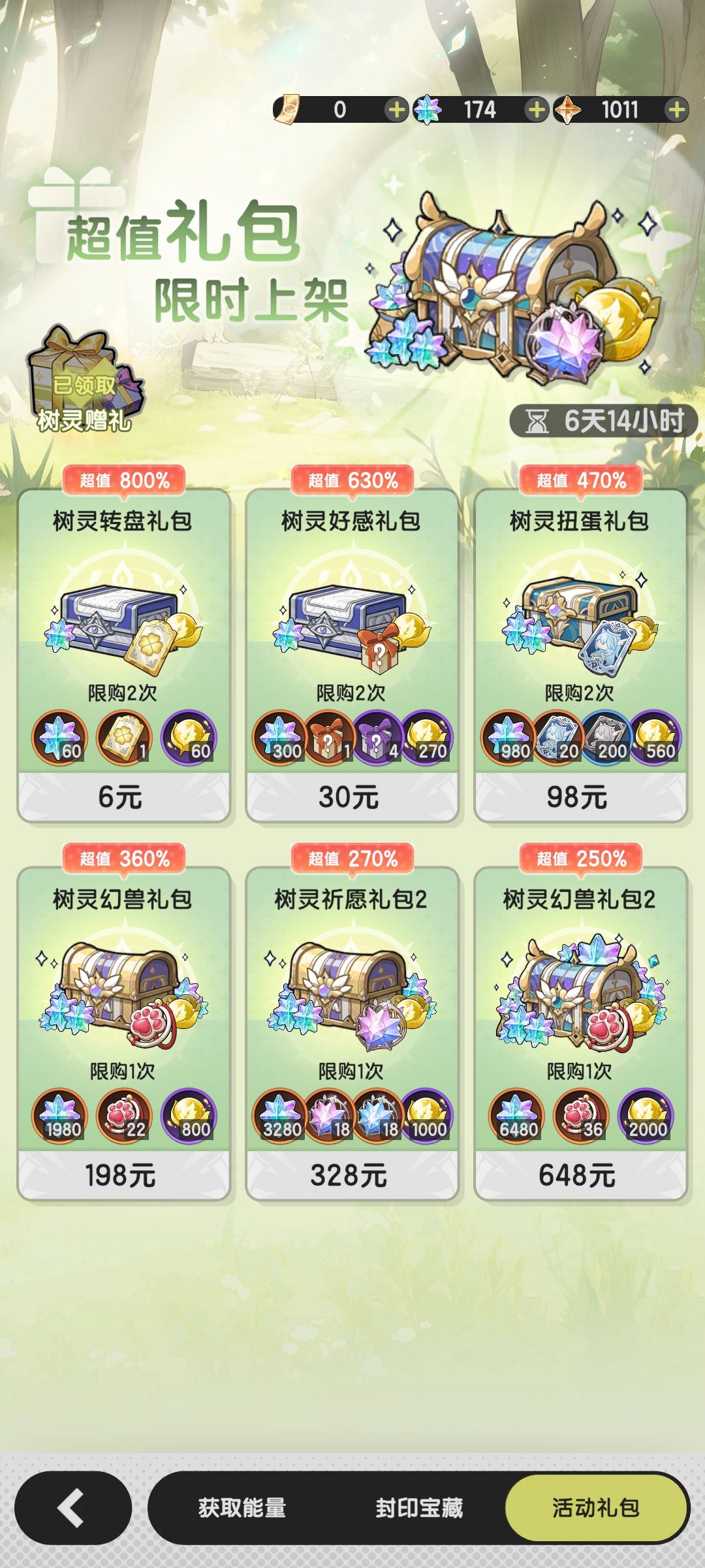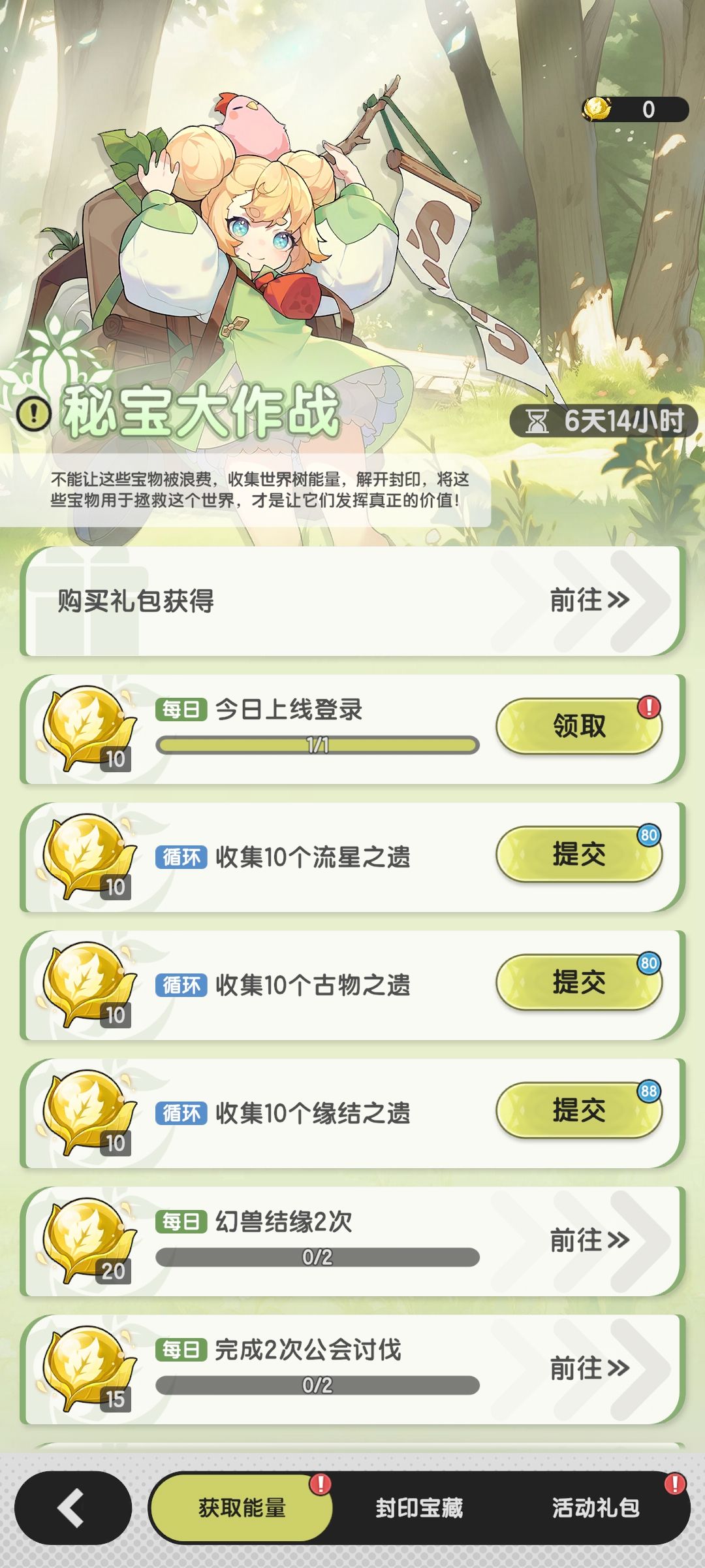 兑换三个80次的循环收集那就可以获得2400。每日任务可以获得100,每周100,活动每周三一个周期也就可以跨两周那就是200。还有免费送10,那么3240-2400-200-10=630,也就是不氪礼包刚好一期活动可以拿一次宝藏五。