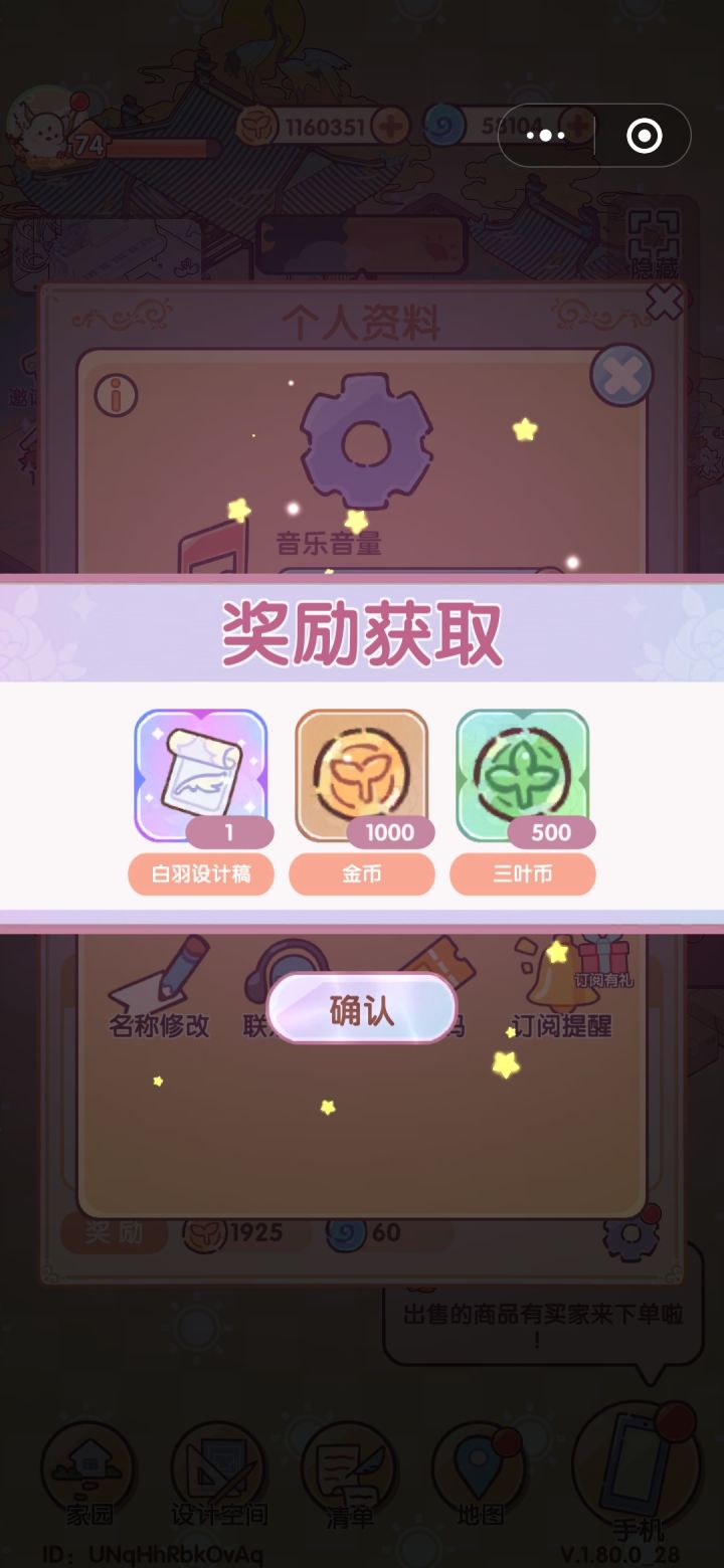 兑换奖励:白羽设计稿×1、金币×1000、三叶币×500
