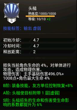 头槌输出一般,重点在于会给目标附带虚弱,降低BOSS攻击,在打单体、前排BOSS效果突出。