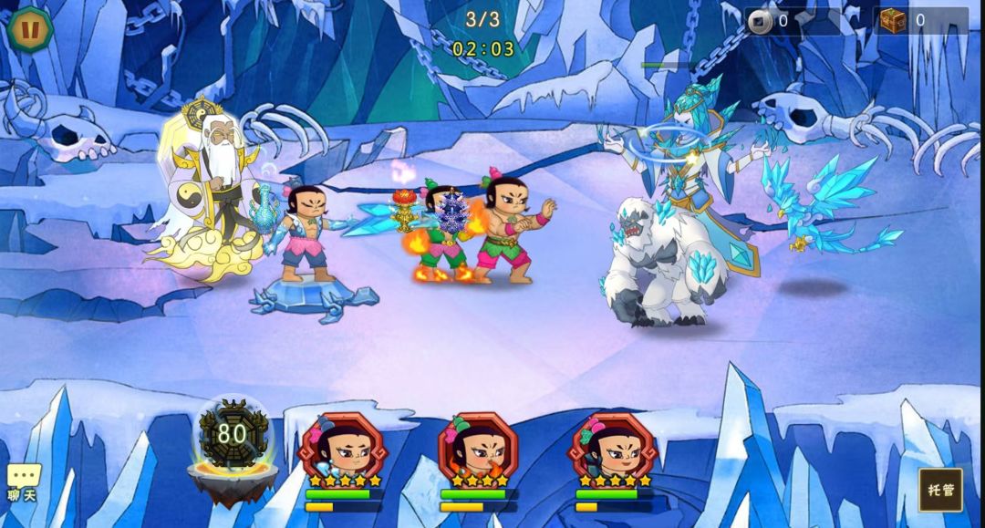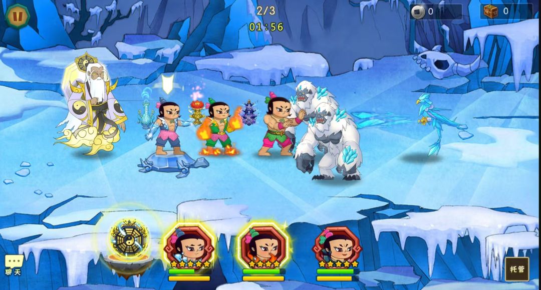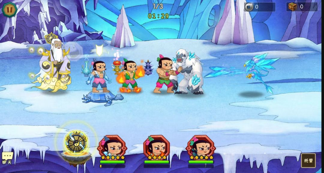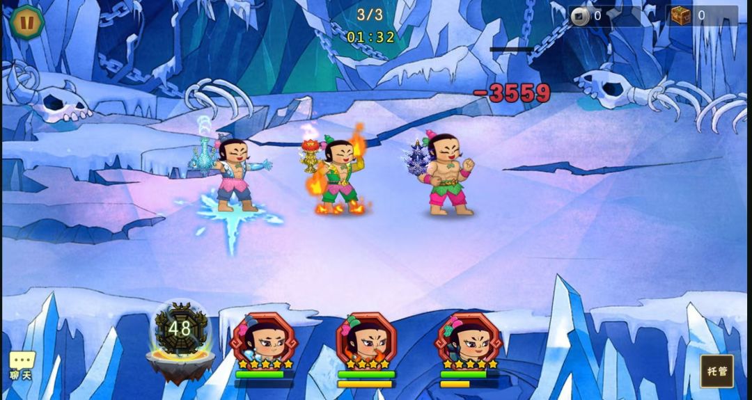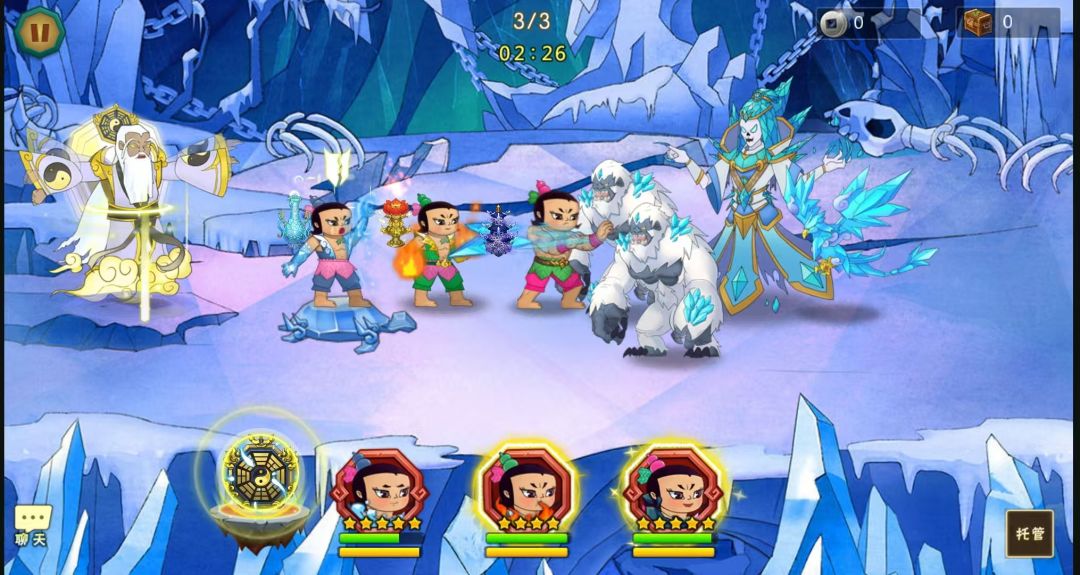 開局先一波技能,打完接法宝再来一波技能,剩下一个召唤雪妖了就留四娃技能打增援,这关怪比较的,要快速消灭不然娃娃扛不住。