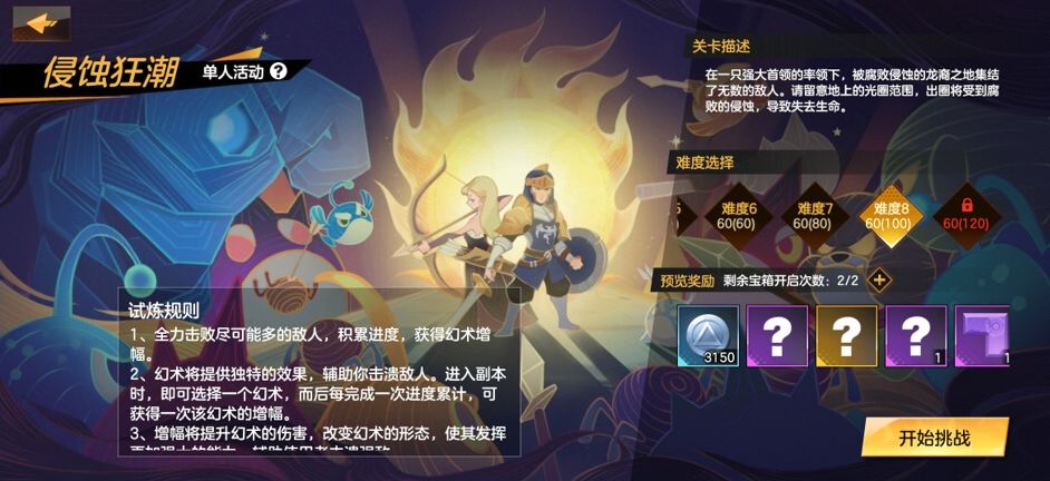 - 在侵蚀狂潮玩法中,冒险者需要全力抵御潮水般的敌人,并在一段时间后击败来袭的首领,以此获得胜利。