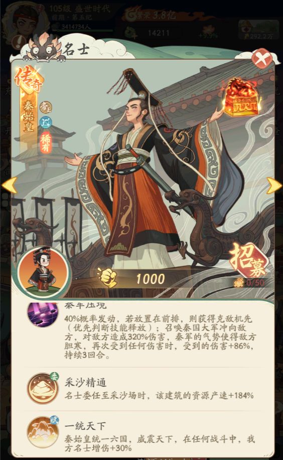 当然我们始皇帝的强大可不止如此,他可是目前唯一一个有信物的名士!而且信物的加成可以和另一位名士共享!!