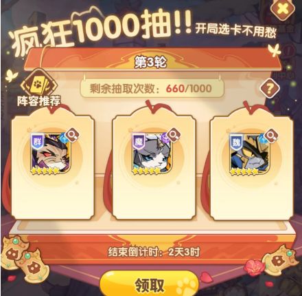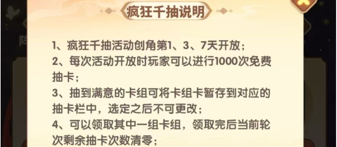 2、每次活动开放时玩家可以进行1000次免费抽卡;