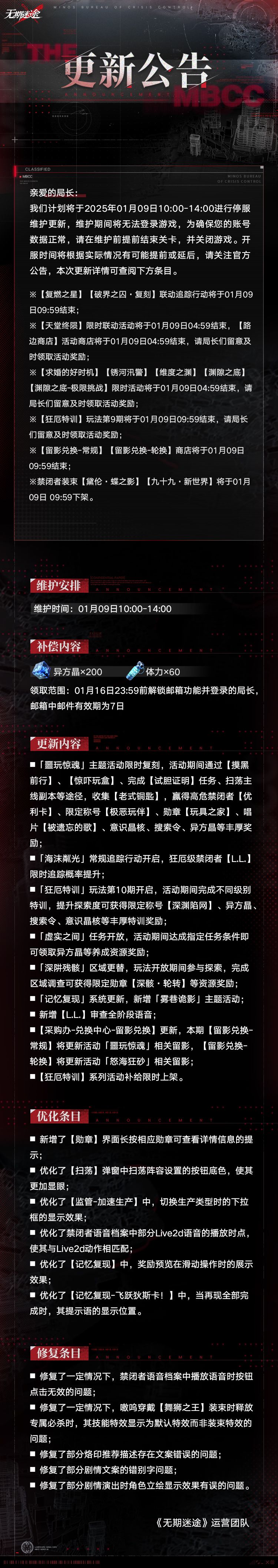 【公告】丨01月09日停服维护更新公告