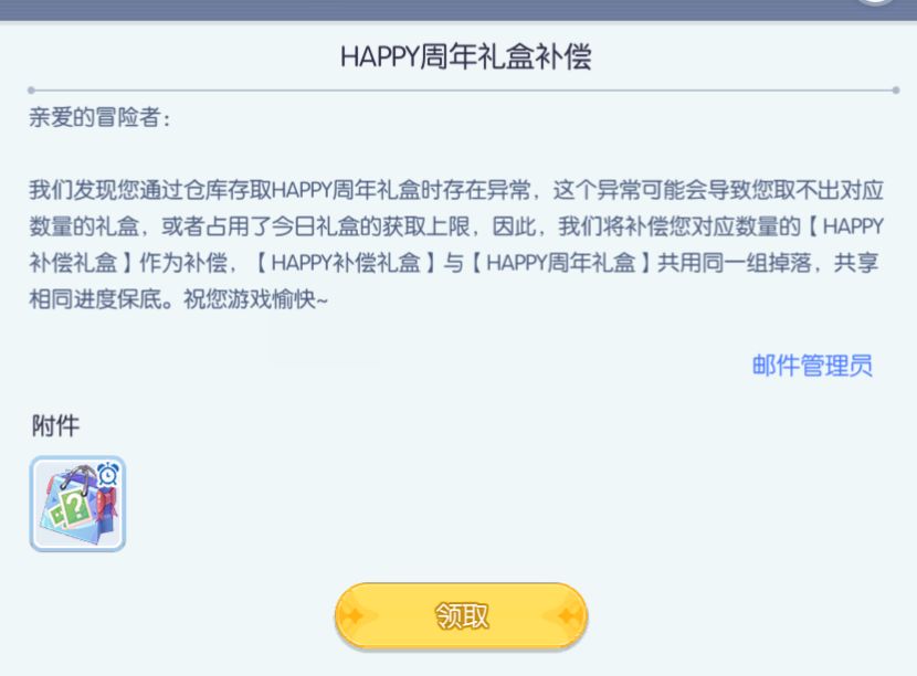 上次修复bug的更新后,我是背号打怪碰巧拿到了HAPPY周年礼盒,就和其他东西一起丢到共享仓库转移给大号,结果因为触发每日获得上限直接给卡没了。