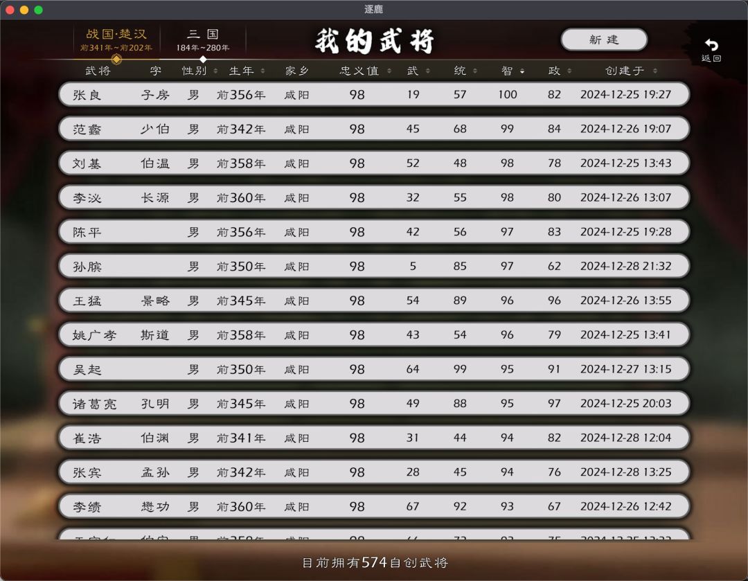 血色衣冠的武将能力最大值是 110,逐鹿能力值最大是 100,为了尊重血色衣冠能力值,基于血色能力值调整, 100 以下的减 5,100 及以上调整到 95-100 区间,并保证每项能力值 99 和 100 的只有一个,95-98 的均有两个,四项能力值 95 以上的均是 10 人,删除部分能力值较低的武将,最终保留 574 名武将