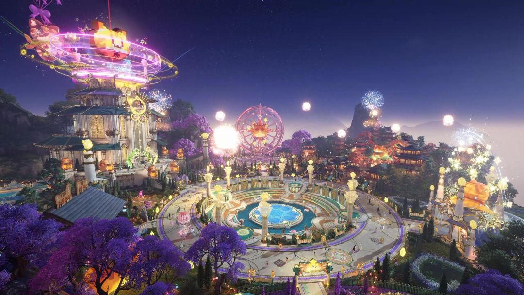 暖色的灯火辉映着雕梁画栋的亭台楼阁,打造出古色古香的国风建筑群。浪漫的花灯与绚丽的焰火点缀在空中,为国风新春增添美好团圆的氛围感。