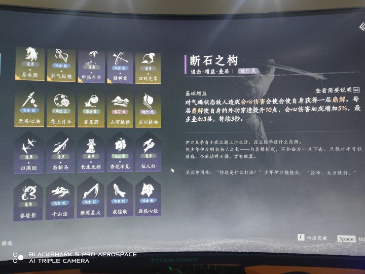 1.心法:由于剑金心法为两本,陌刀一本,奶扇一本,双刀一本,攻伞一本,通用金心法两本,并且所有武学心法都是专属心法,换句话就是如果你的武学是积矩九剑那么剑气纵横是必带的、如果你是双刀泥犁三垢那么忘川绝响是必带的。所以只有通用的金心法是可以斟酌的,通用金心法易水歌:未央城唐宝5000长鸣玉可换,输出和治疗必带心法,属于通用中的通用。通用金心法四时无常:开封曹生书画店5000长鸣玉可换,通过易武技也就是切换武器出来的那一次攻击来获得增益,持续时间10s,cd30s,易武技相当卡手,所以未来可期只能在心法突破等阶拿来用。紫色心法只拿开荒好用的来说。长生无相:通过卸势来获得增益。征人归:所以伤害和治疗增加百分之五,但是挨打会失去效果5s并且受到的伤害增加百分之五。所恨年年:降低敌方外攻防御。杏花不见:增加治疗效果。断石之构:对气竭敌人增加穿透和会心伤害。抗造大法:护盾时间延长。移经易武:根据使用武器获得进攻增益。凝神章:看破期间增加会意伤害且概率减伤。