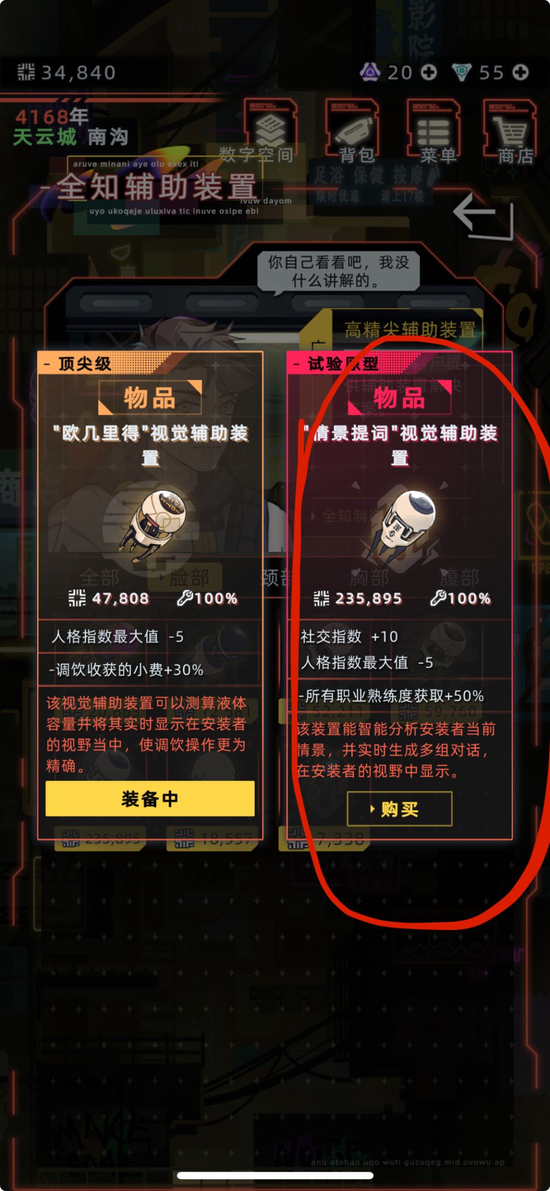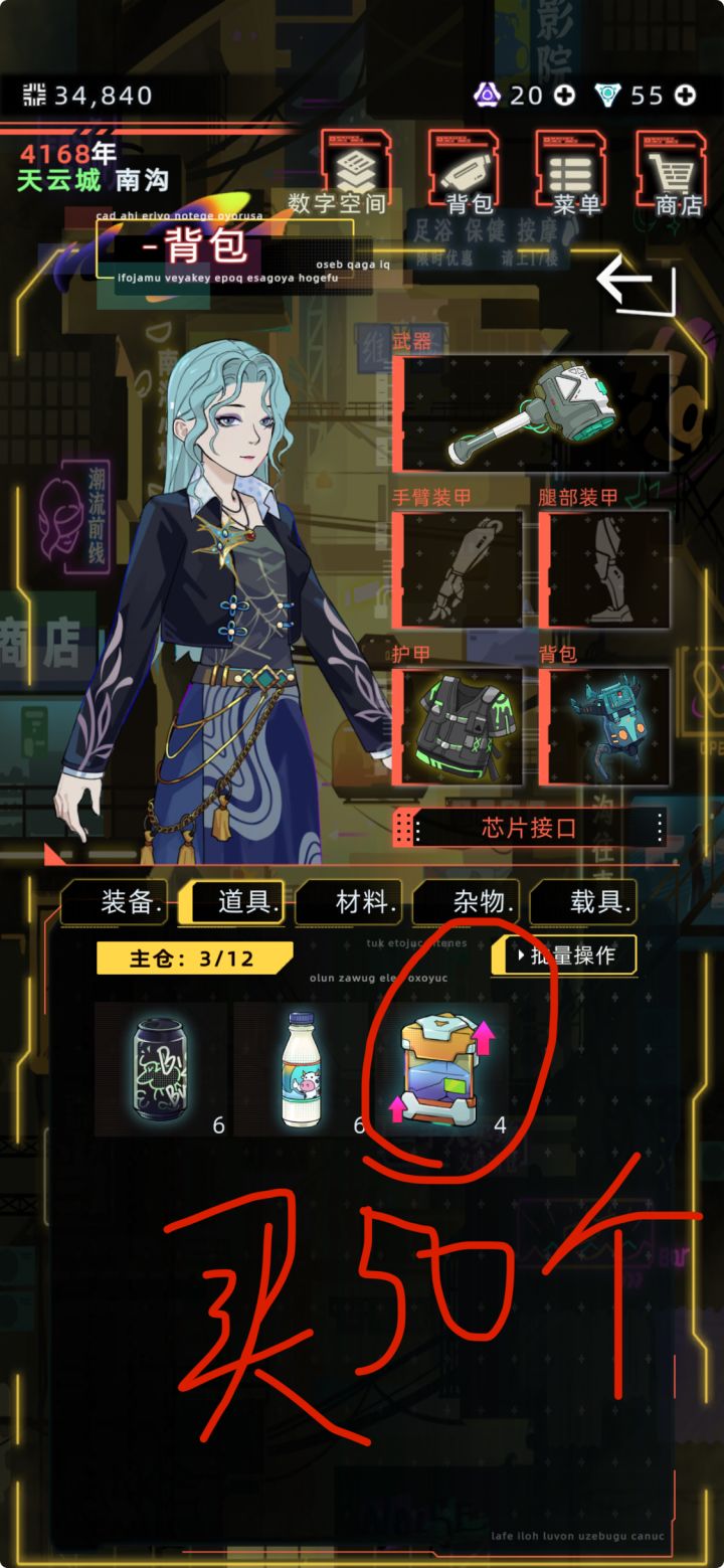 第一步:天赋记得带高效工作!然后去买50个图3的体能活跃液(减压力用)再去全知辅助装置购买图四4预防肝脏衰竭的装置,购买图五的加50%的职业熟练度红色装置,购买图6加30%职员熟练度的橙色装置,去装甲站换上