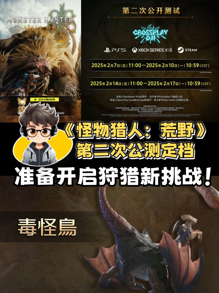 《怪物猎人:荒野》第二次公测要开启了!卡普空宣布,《怪物猎人:荒野》第二次公开测试将于2025年2月7日至2月10日、2月14日至2月17日举行。本次测试将登陆PS5、Xbox Series X|S和Steam平台,并新增回归怪物“毒妖鸟”的狩猎任务,各位老猎人们又到了挑战你的时候了!🎮✨