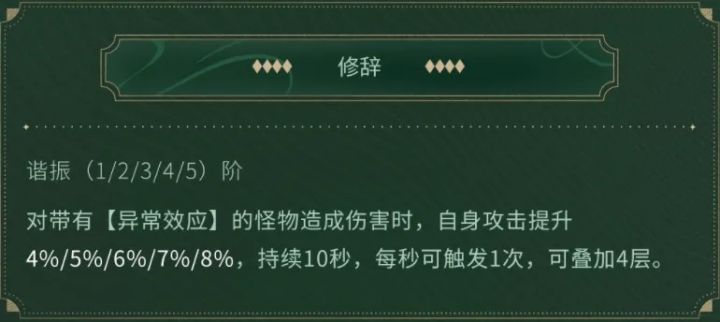 特殊效果也是对使用者自身的攻击小幅提升,但是这里也有一个前提,需要使用者对带有异常效应的怪物造成伤害才可以触发效果,这里的异常效应是2.0黎那汐塔推出的全新战斗机制