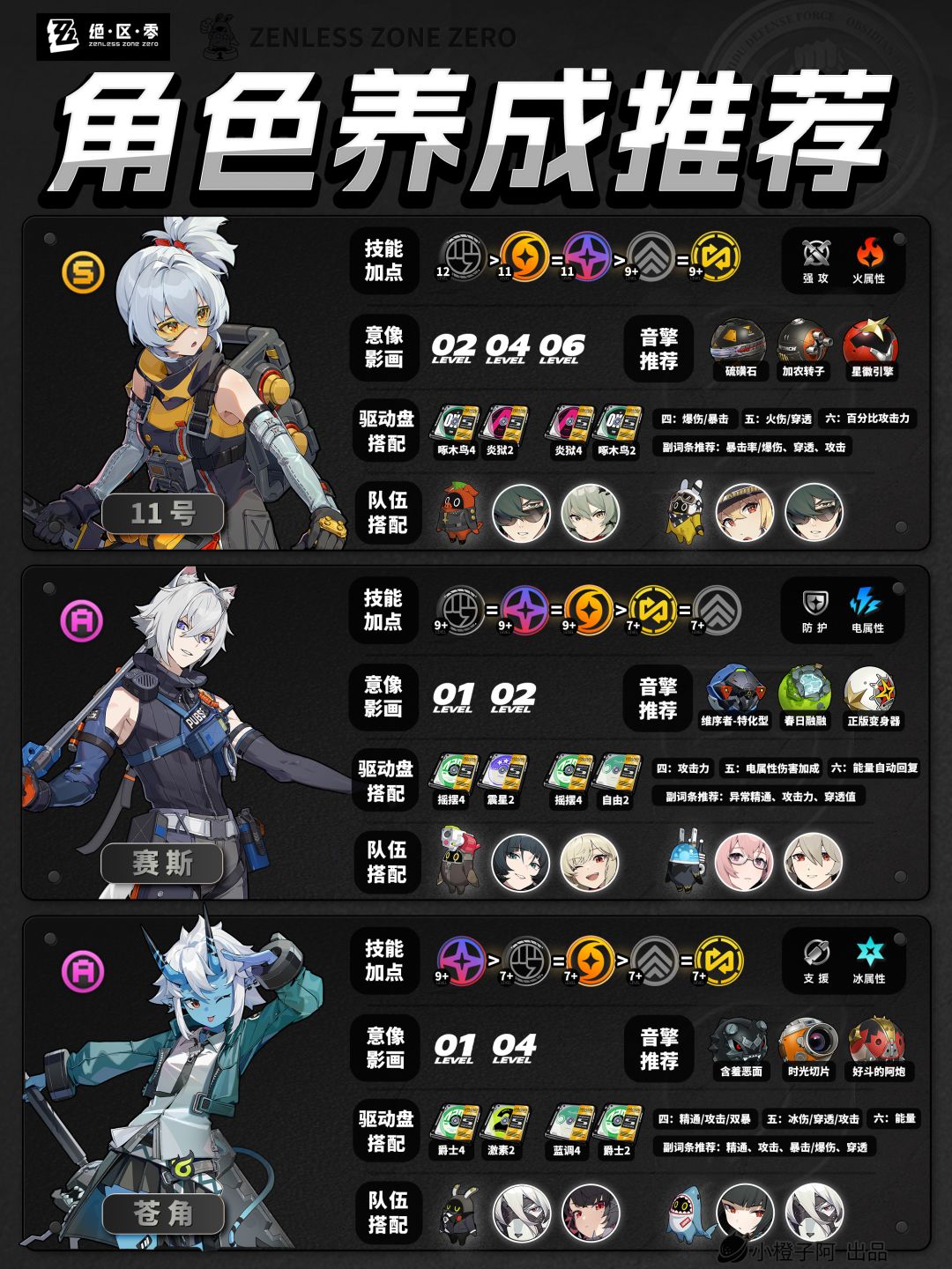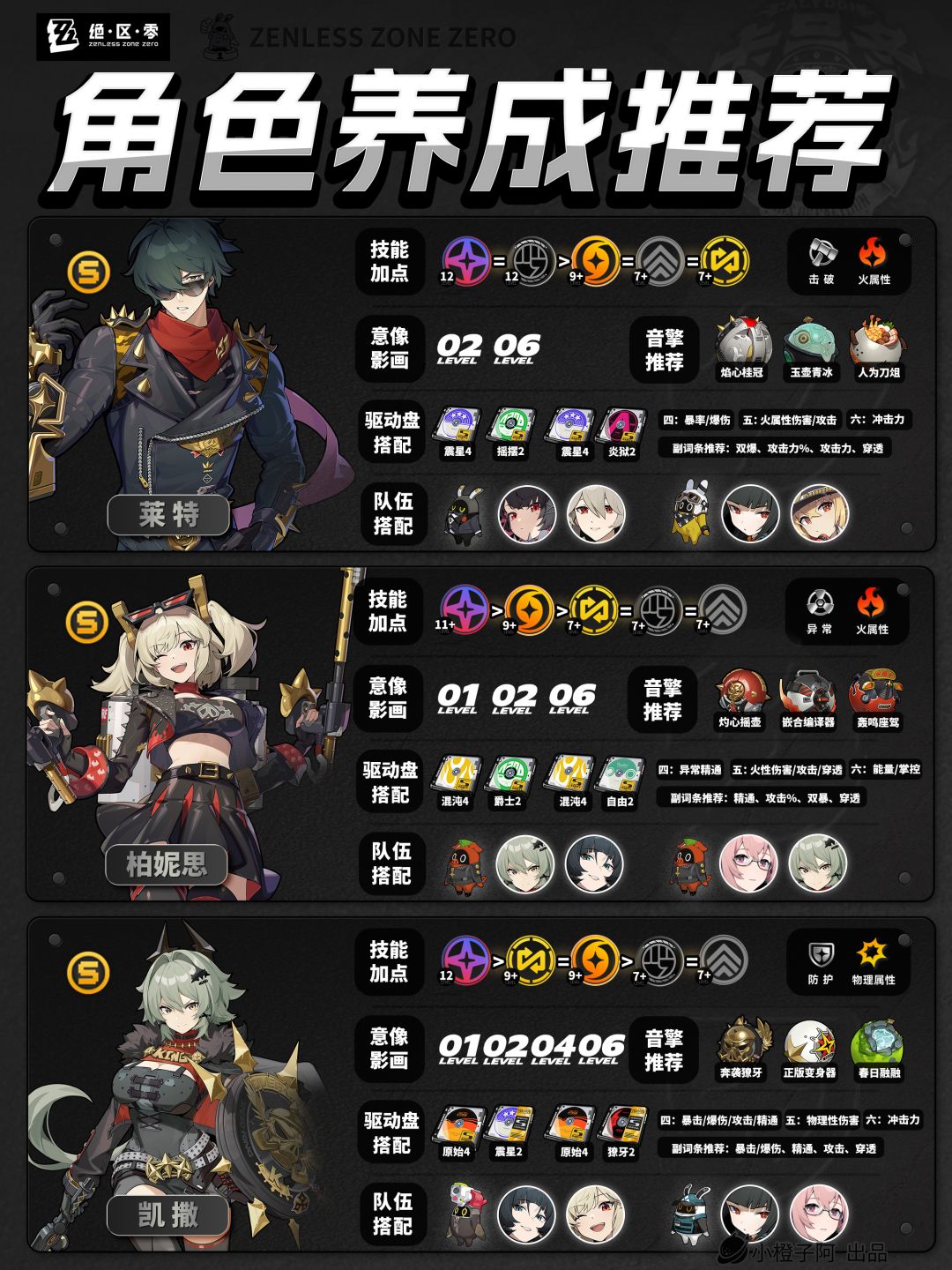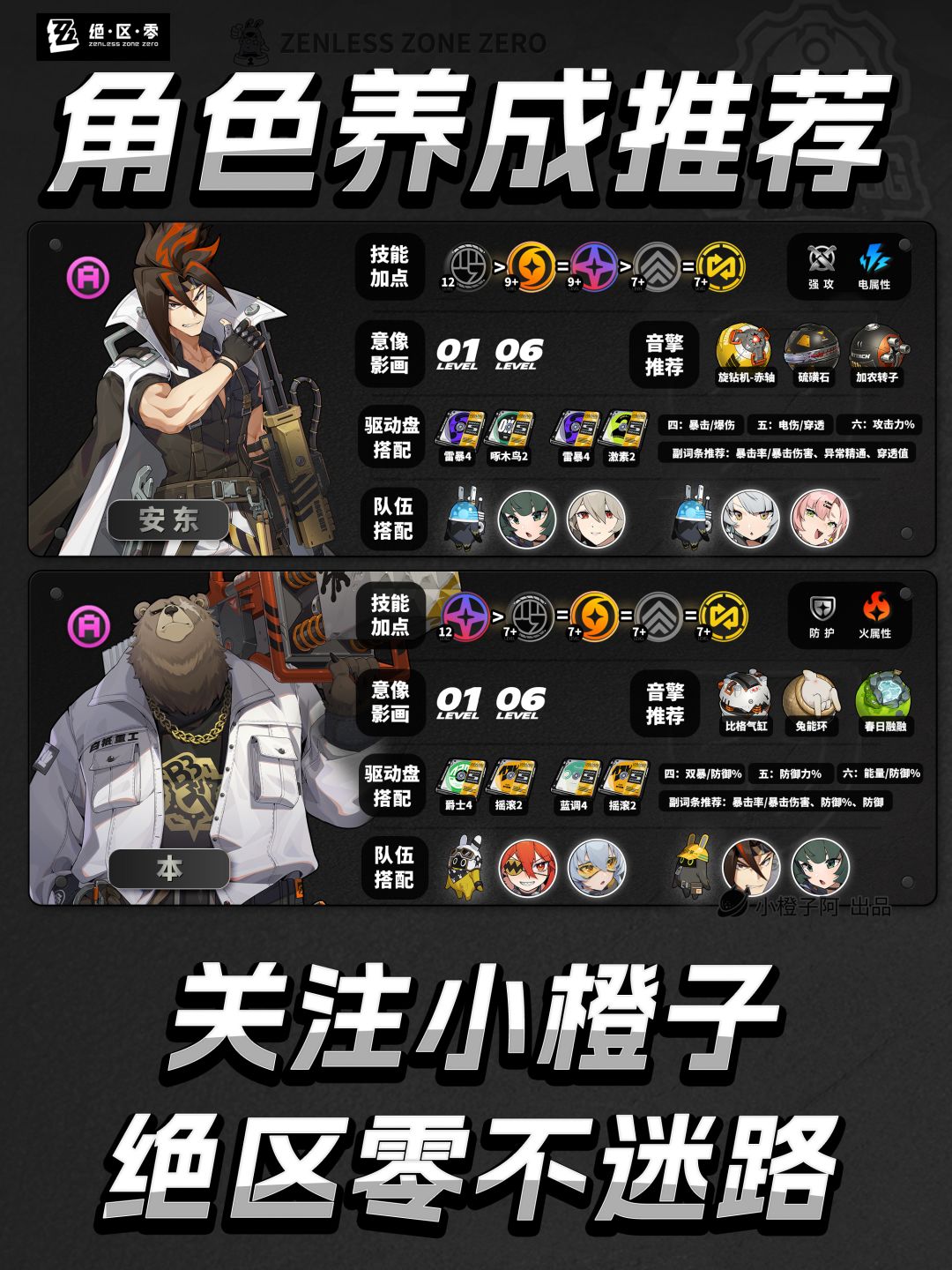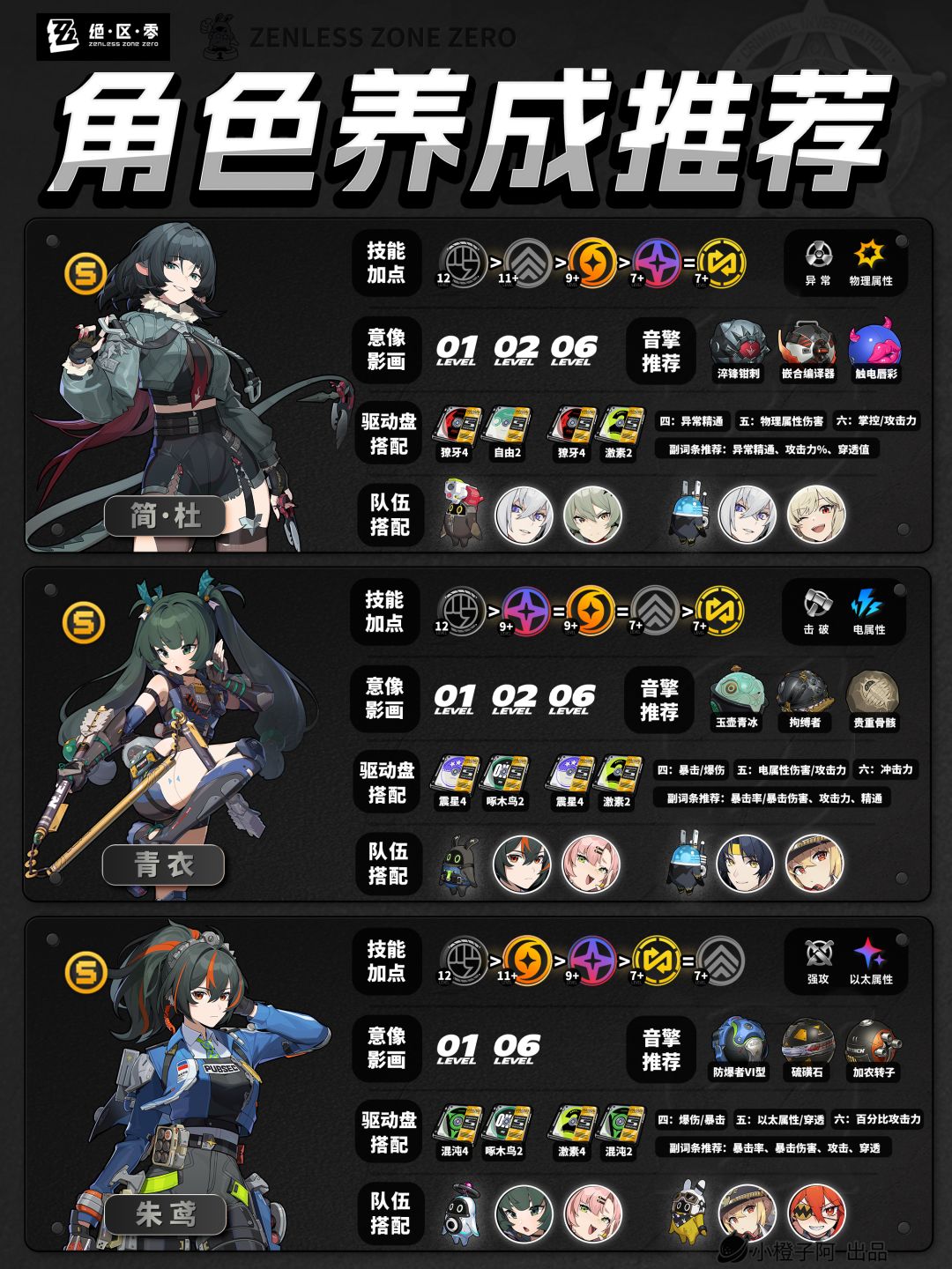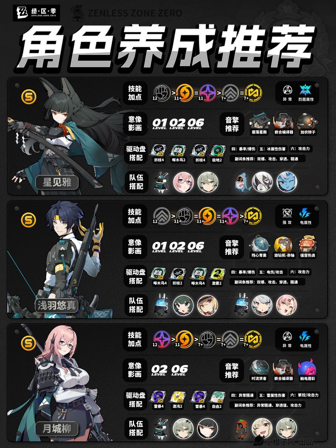 之后1.5.0会以此篇为基底,根据版本更新内容、评论区反馈指正,进行翻新,及时带来最新的全角色攻略。(在此感谢评论区的各位大佬指正!)再就是一点,由于图片大小的限制,橙子每次是把角色配队更新到最新角色的组队情况,但并不代表角色只能有这两个配队,比如支援角色【丽娜】,丽娜可以加入绝区零大多数的队伍,而不仅限于下方展现的两种配队情况。