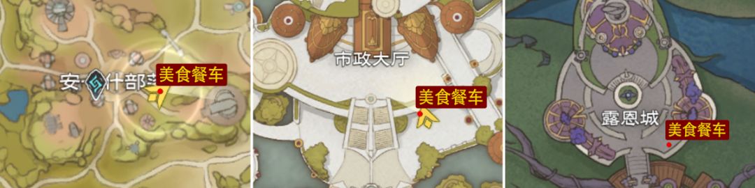 烹饪制成的美食可用于开启美食宝箱,宝箱分布在三张区域各处。第一日宝箱位置如下: