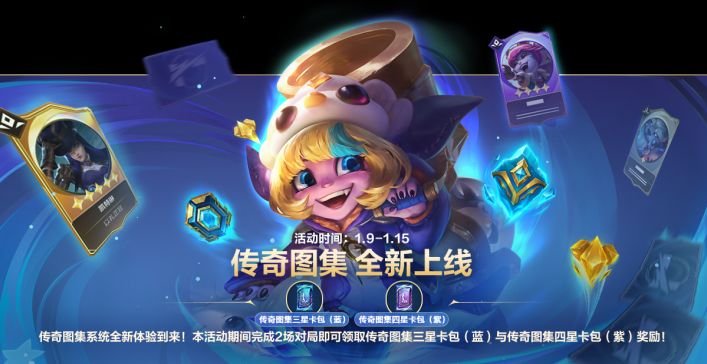传奇图集系统全新到来!1月9日(明日版本更新后)-1月15日23:59活动期间,召唤师完成2场对局即可领取传奇图集三星卡包(蓝)与传奇图集四星卡包(紫)奖励!