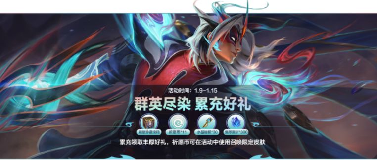 在1月9日(明日)0点-1月15日23:59活动期间,召唤师累计充值点券达到指定数量还可领取殿堂珍藏道具随机宝箱,祈愿币可在活动中使用召唤群英尽染限定皮肤!