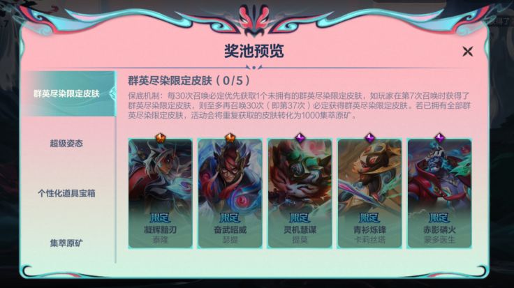 (3)保底机制说明每召唤30次必定优先获取1个未拥有的群英尽染限定皮肤,如召唤师在第7次召唤时获得了群英尽染限定皮肤,则至多再召唤30次(即第37次)必定获得群英尽染限定皮肤。