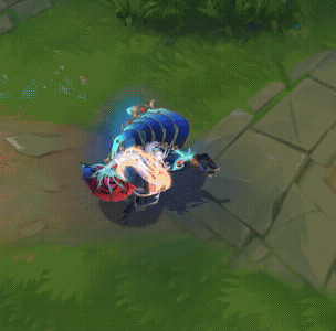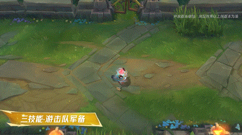 主动:提莫向前翻滚冲刺,并因此获得被动部分的双倍移速加成,移动时油彩之力在身后涌动,带有蓝色油彩拖尾特效。这个移速加成效果在被攻击时也不会移除。