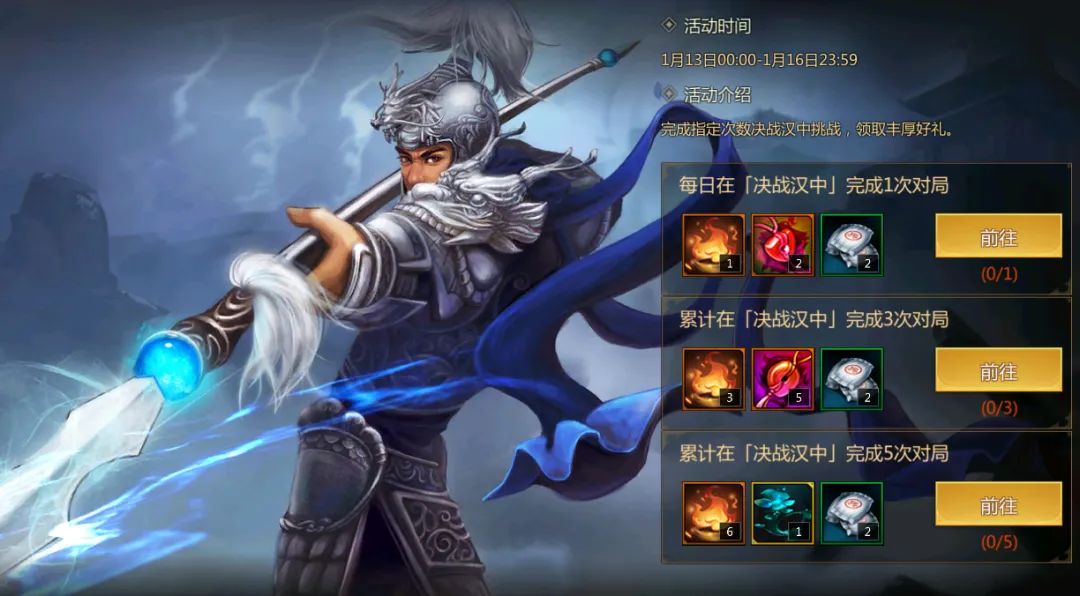 ▶ 【累计】在「决战汉中」完成3次对局,可获得薪火*3、幸运玉佩*5、兵粮卡*2