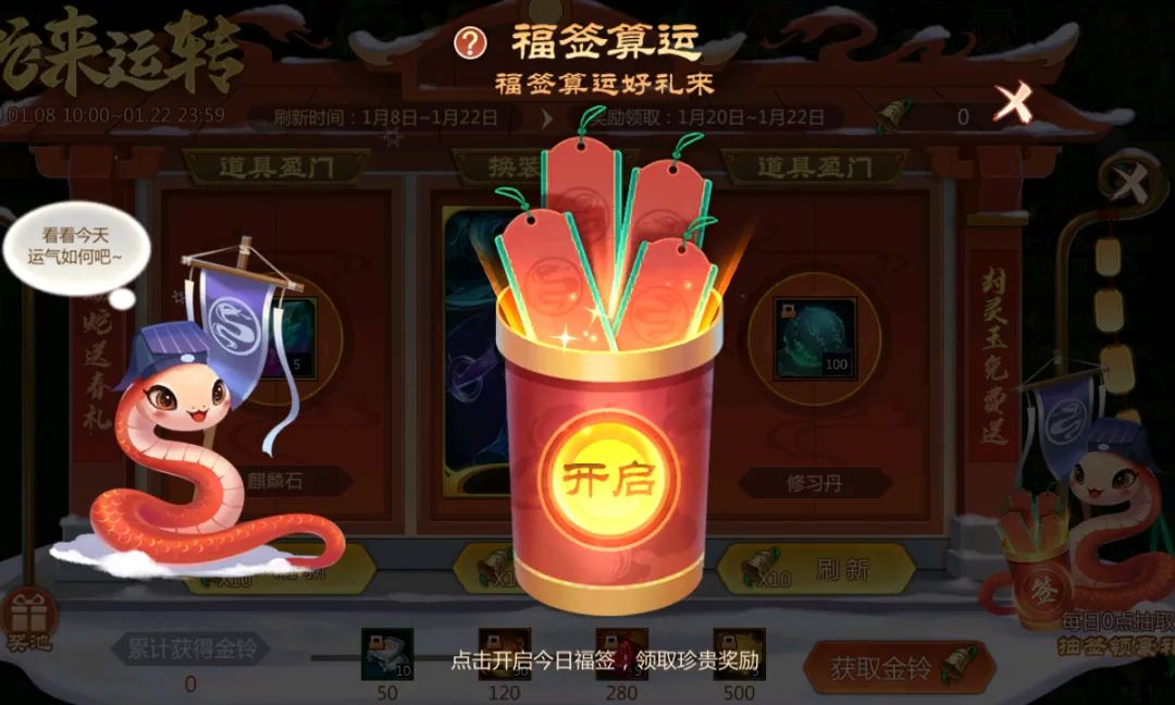 蛇来运转,迎春送福!活动期间,三扇盈门可刷新2件道具和1件换装。仙术师可通过抽签、完成任务获得金铃,使用金铃刷新盈门奖励。