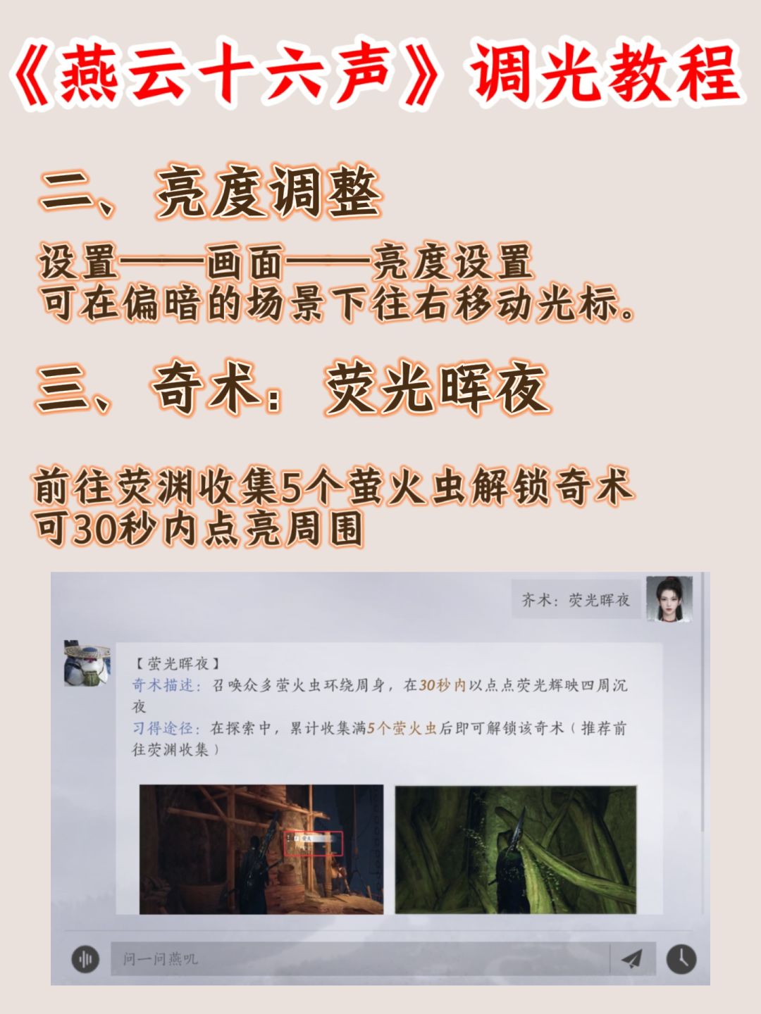 刷到有人觉得燕云十六声的场景太暗了,整理了3个简易的调亮度教程,希望对大家有所帮助!