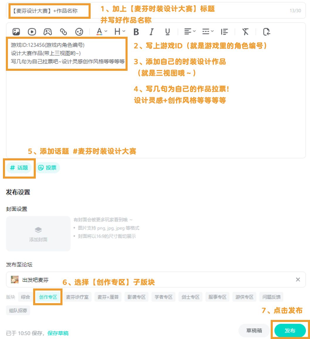 - 请将您的作品上传到TapTap《出发吧麦芬》论坛中的【创作专区】中,在发布作品时添加话题 #麦芬时装设计大赛,并在标题中添加【麦芬时装设计大赛】字样。