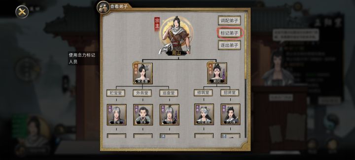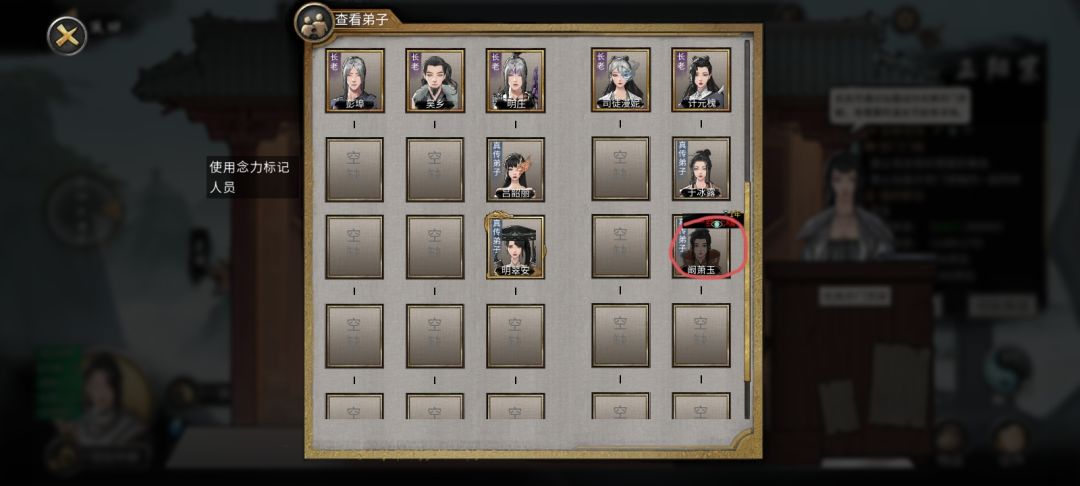 有弟子死亡时,如果想救某个弟子就可以点击标记弟子。此刻会出现一个使用念力标记人员的提示。然后往下滑 ,找到你要标志的弟子。点击弟子的头像就可以了。
