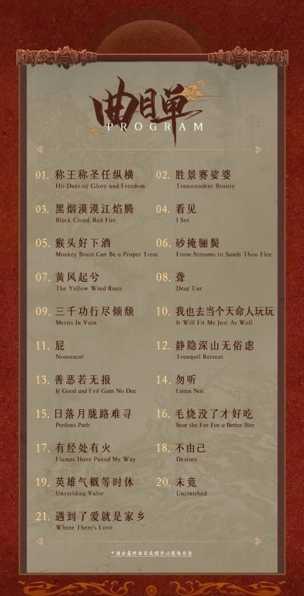 演出曲目精选自《黑神话:悟空》游戏内音乐,交响与国乐交织,共谱前所未见的冒险史诗。更有游戏内动画短篇集等,带你重回西游,沉浸式体验雄奇壮丽,光怪陆离的东方神话世界。