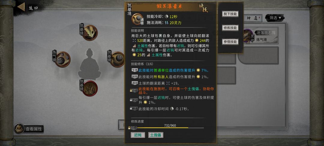 遇到境界太多的一定要念头通达。赶紧变成土球跑路,跑路失败就用技能拖到第二次跑路时间。哎!对面打不着!(看看后期能不能无CD一直不可选中)