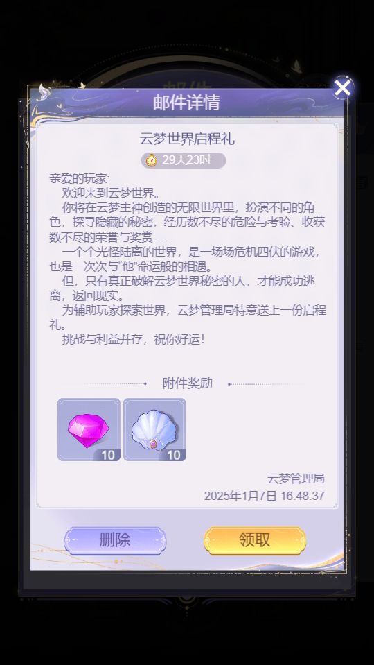 ※ 当首次进入云梦世界,玩家均能收到云梦管理局给各位下发的「云梦启程礼」,各位玩家可前往邮件进行领取。