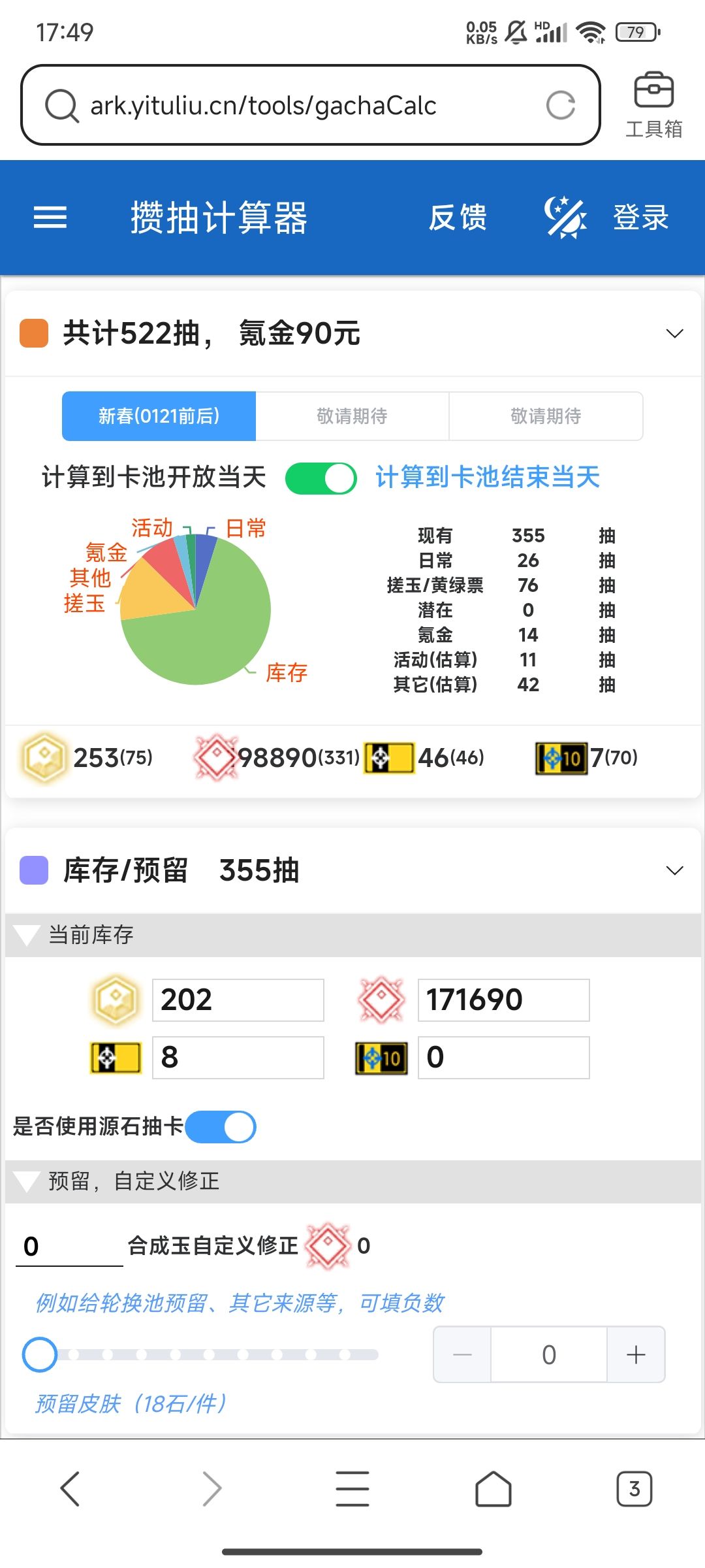 前言:顺便给入坑和回坑的博士当个参考,首先建议收藏下面这个攒抽计算器的网页链接也可以b站关注罗德岛基建beta、公孙长乐。除了攒抽计算,还有材料刷取、氪金礼包的性价比计算。