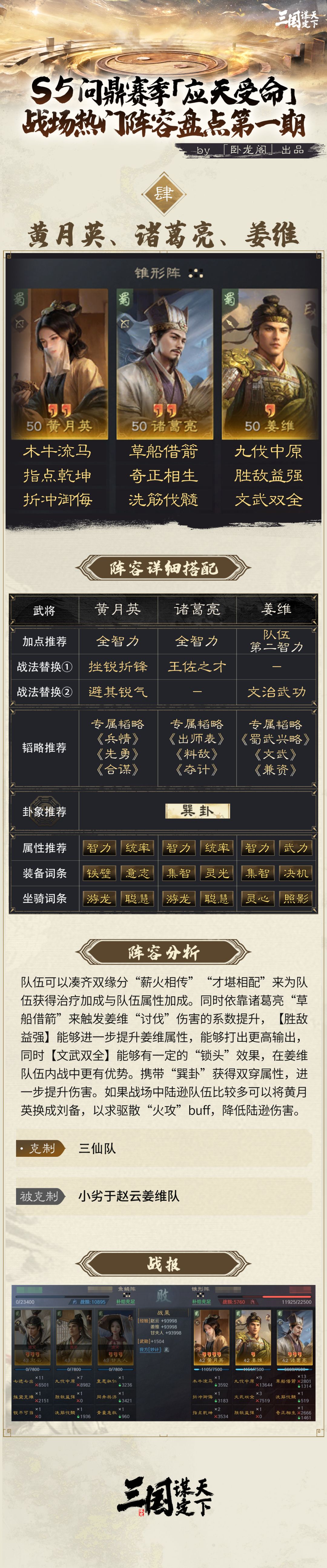 本期【卧龙阁】为大家带来“S5问鼎赛季战场热门阵容推荐”,每套阵容都附有韬略推荐、加点建议、阵容分析、克制关系以及卦象推荐推荐。让我们一起看看,当前战场的热门阵容都有哪些吧!