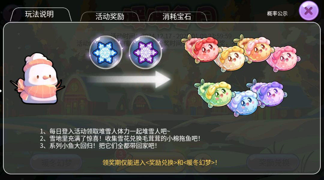 1、本活动分为三部分:一起堆雪人、暖冬幻梦、奖励兑换;