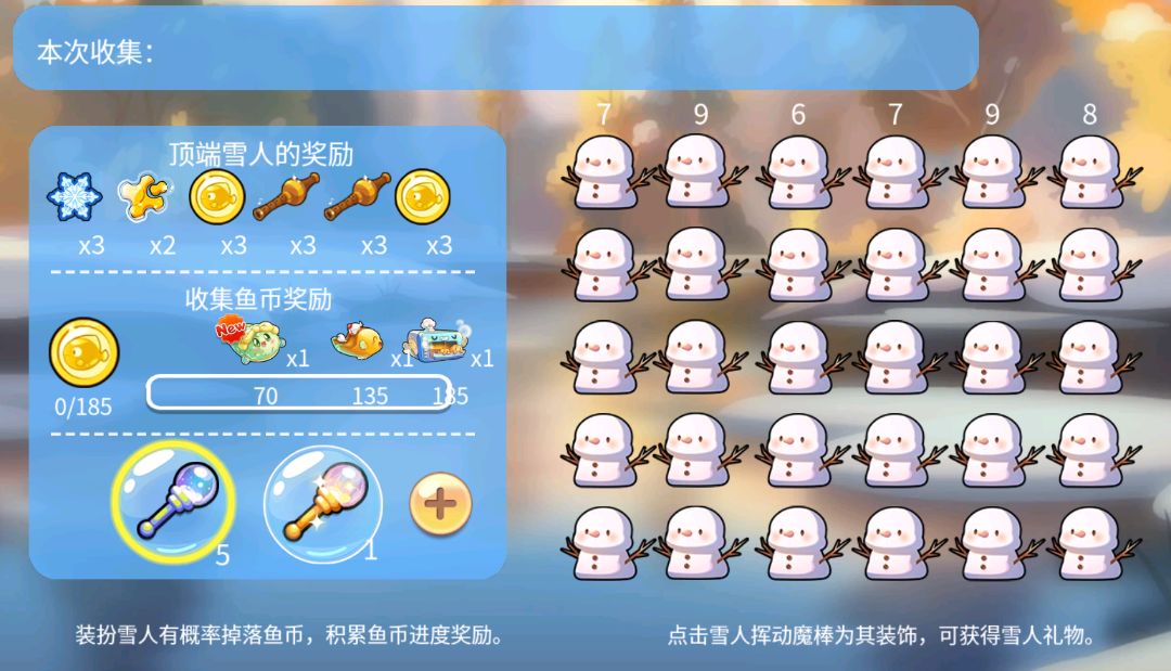 完成一起堆雪人后,获得的积分就可以到暖冬幻梦、奖励兑换中领取你喜欢的鱼儿啦~