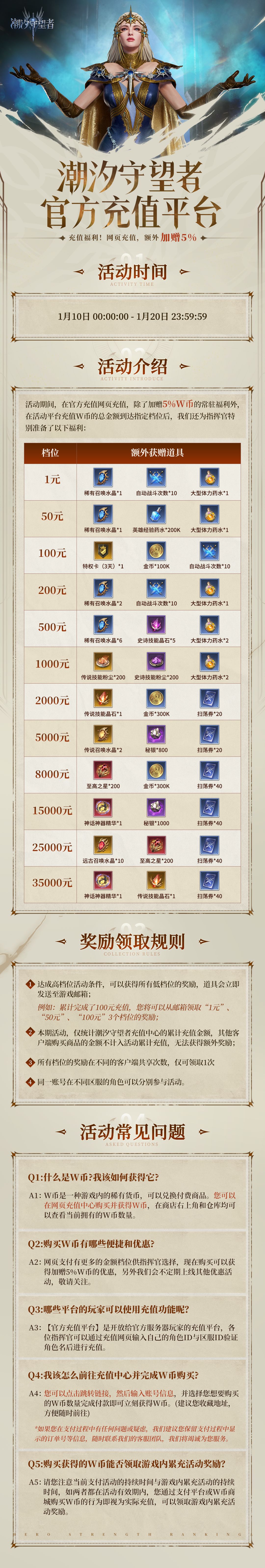 活动期间,在官方支付平台充值,除了加赠5%W币的常驻福利外,在活动平台充值W币的总金额到达指定档位后还可额外获赠远古召唤水晶、至高之星、神话神器精华等道具奖励,戳下图查看详情↓↓