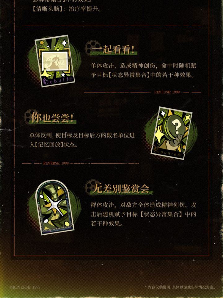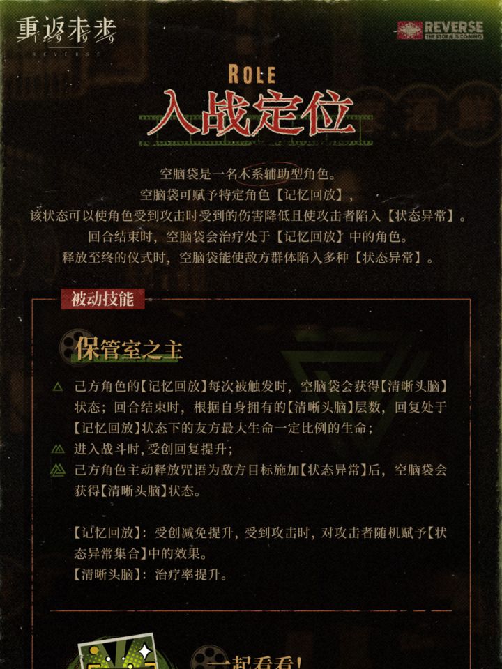 空脑袋具有非常强的施加状态异常能力,核心是利用2技能开启反制(【记忆回放】状态),提供减伤和受击时使攻击者陷入状态异常。