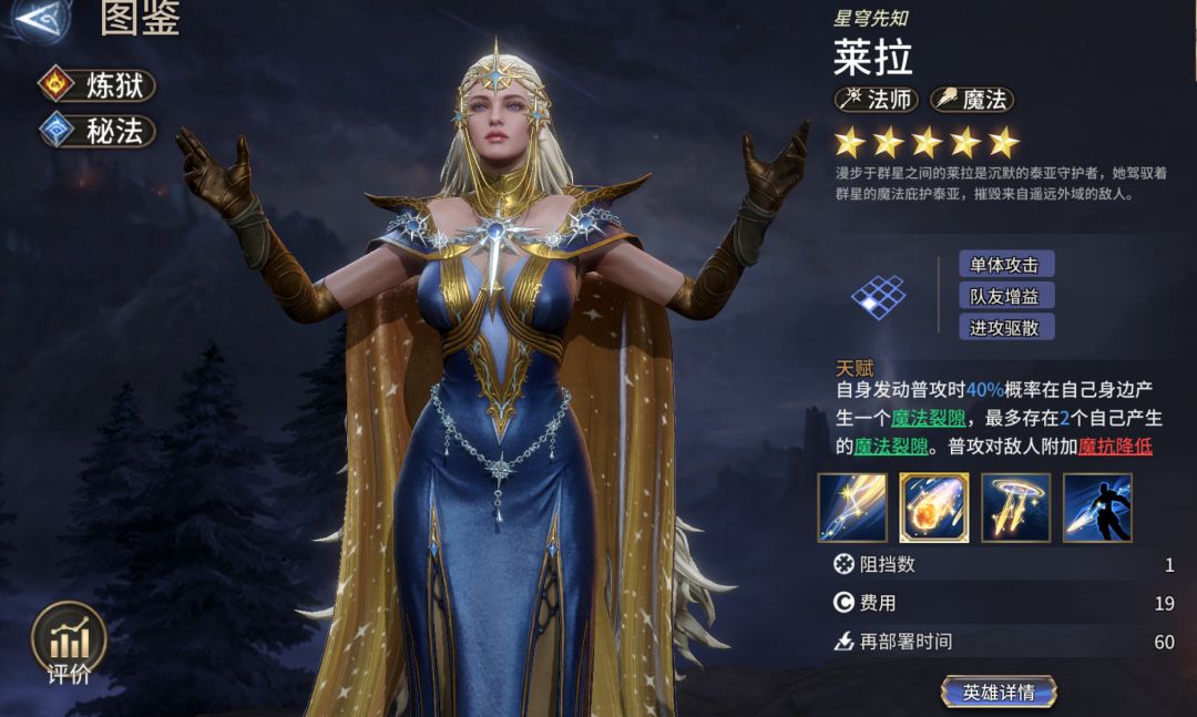 莱菈本身并非“刚需级”英雄,主要就业空间是公会龙,其可通过魔法裂隙复制攻击,并且可降低敌方魔抗,在炼狱队中可打出更高分数。此外莱菈单体输出较高,并且有易伤,也能用于装备Ⅰ模式。莱菈降低魔抗的特性,与小丑、喀美特、天使等一线英雄都有较不错的联动,如果有抽到可以养起来备用。
