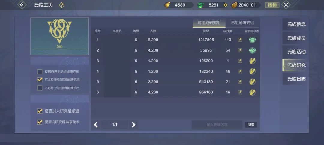 氏族研究可以让本氏族和其他氏族组成研究组。组成研究组后,其他氏族已经研发的氏族秘术进度,可以共享给本氏族。(需对方氏族开放共享秘术权限)