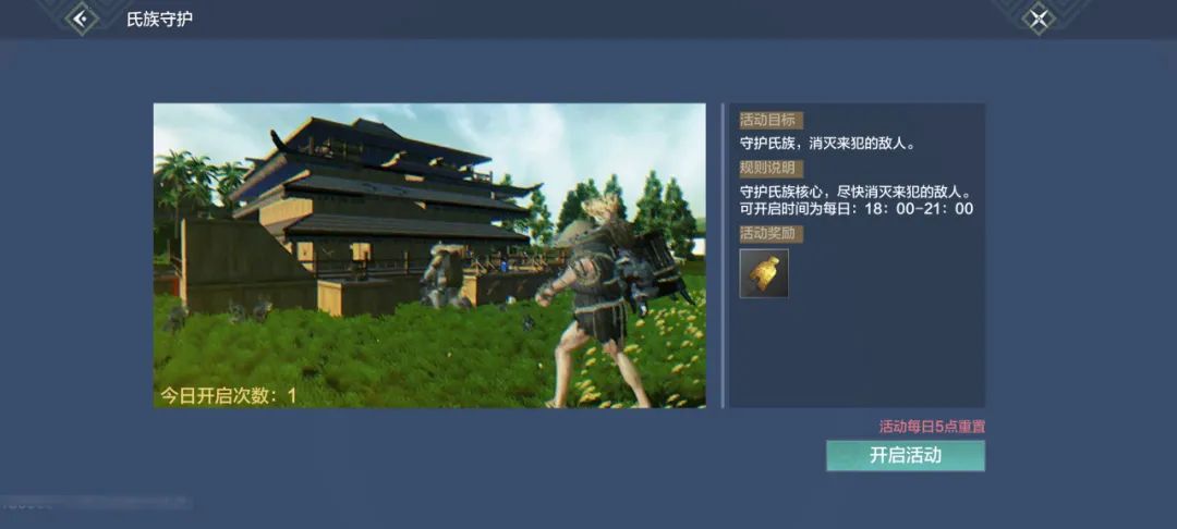 每日18:00-21:00,族长都可以开启氏族守护。在氏族守护期间,氏族领地(即族长家园)将会有多波敌人来犯,消灭敌人,成功守护氏族核心(族长家的息壤),即为守护成功,参与人员都可以获得氏族贡献。(非氏族成员,也可加入族长团队参加活动,领取奖励)