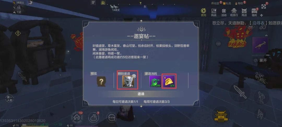家常宴消耗2500贝币,随机邀约5位家园访客(常侍);鼎鲜宴消耗200脂玉,随机邀约5位家园访客(常侍、御侍、神侍皆有),消耗特定道具可指定邀约。