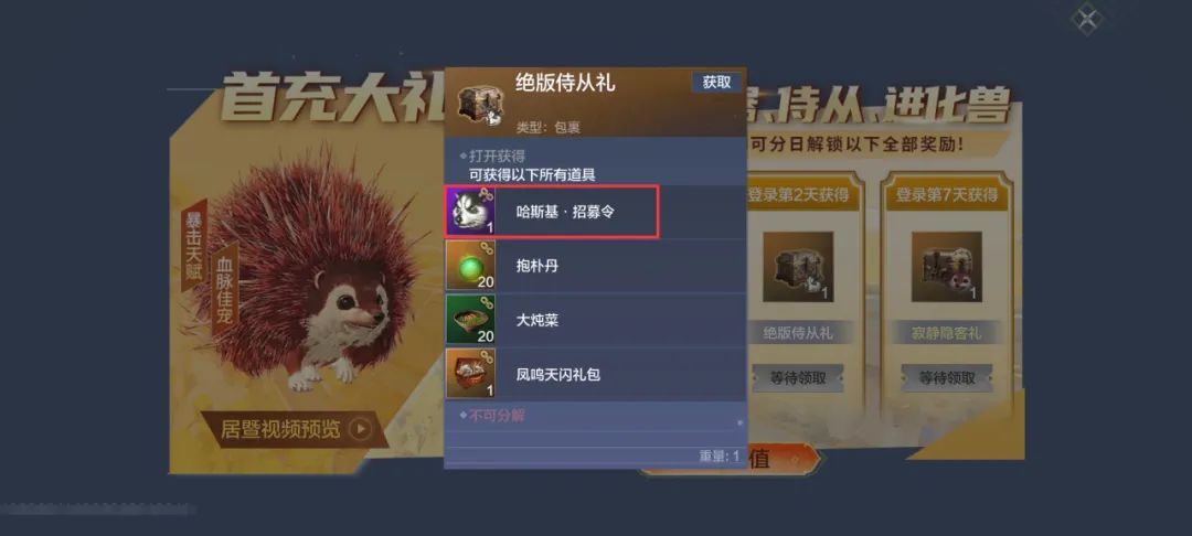 在新手期旅者可以招募的侍从非常有限,此时旅者等级已经达到招募丁级神侍的需求,但是异人货币却还未攒够。因此,妄妄推荐旅者先拿下首充赠送的侍从哈斯基。前期哈斯基完全够用,之后资源攒够后再换神侍。(PS:首充还会碎空定海神珍、凤鸣天闪、千年·居暨等好物。定海神珍、天闪上手简单,前中后期都可使用;居暨对群攻击较强,可在水下攻击,用来刷图腾效率很不错。)