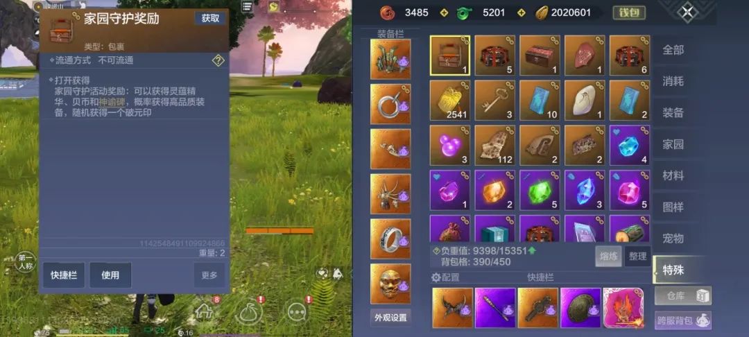 这里插一嘴,家园守护的玩法与氏族守护类似,旅者息壤解锁“乾坤仪”后,每日都可以和乾坤仪交互,开启家园守护。完成后可以获得贝币、灵蕴精华(可在【商店-成长-灵蕴】处购买灵蕴)、神域碑(5个可合成个魔化蚩尤图)、破元印(破除巨兽的天神庇佑效果)等物品。
