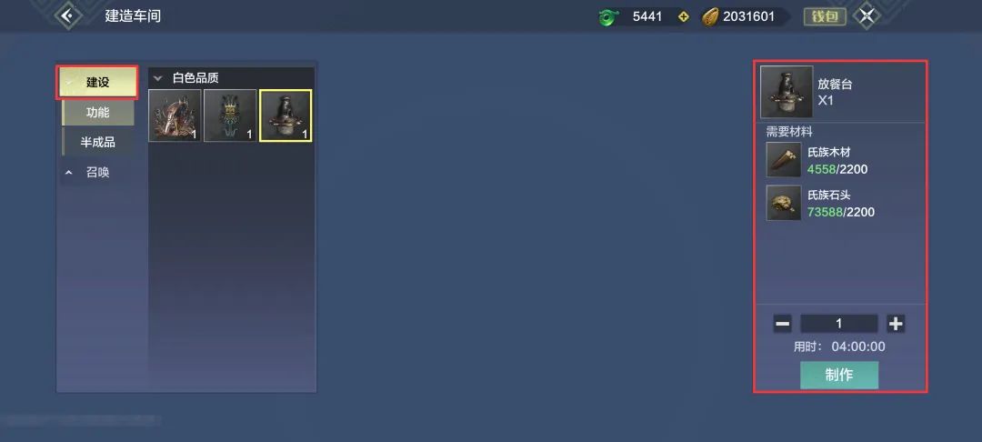 ● 氏族工作台:是制作设备、氏族BOSS召唤符的设备,可直接放置,其余设备需要先放置氏族工作台,在氏族工作台制作出来后才可放置。