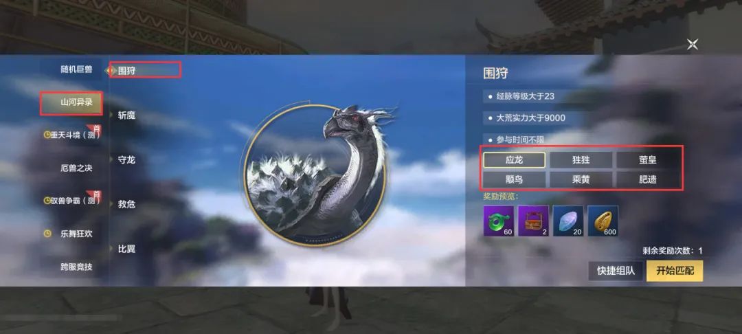 以上玩法每日可获得奖励次数都为1次,记得每日参与。另外,随机巨兽不同档位的每日奖励次数各有1次,但围狩不同档位共享1次奖励,注意根据自己当前等级、战力调整参加的难度档位,获得更丰厚的奖励。