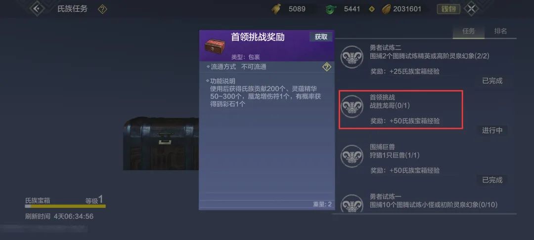 特殊日常-首领挑战,需要族长先在工作台制作【龙哥挑战符】,使用龙哥挑战符召唤龙哥后进行挑战。完成击杀的旅者可获得氏族贡献、灵蕴精华、蜃龙增伤符(挑战氏族BOSS蜃龙时使伤害提升)等。